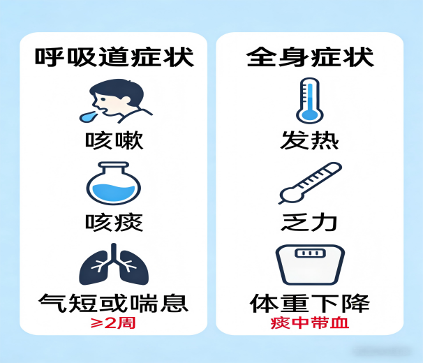 呼吸道:咳嗽咳痰≥2周、痰中带血、胸痛、胸闷、呼吸困难;