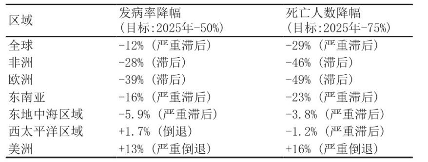 全球仅实现发病率降 12%、死亡数降 29%,距 2025 年目标(-50%、-75%)严重滞后;